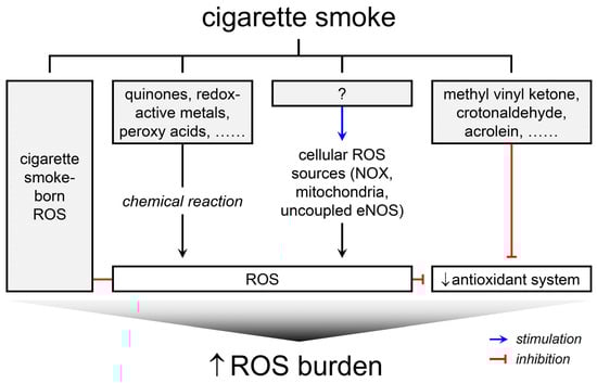 ROS serve as common pathogenic mediators in the development of health problems caused by smoking. There are ROS inherently present in CS. Additionally, CS induces ROS formation through chemical reactions between its constituents and biomolecules, and stimulates cellular ROS sources to produce ROS. Furthermore, CS disrupts the antioxidant systems, influencing the redox state and consequently amplifying ROS functions. Collectively, all these ROS contribute to the ROS burden placed by CS exposure (Figure 1).