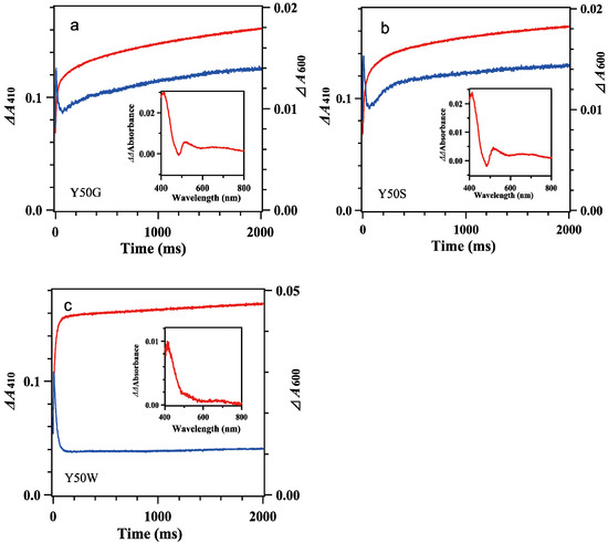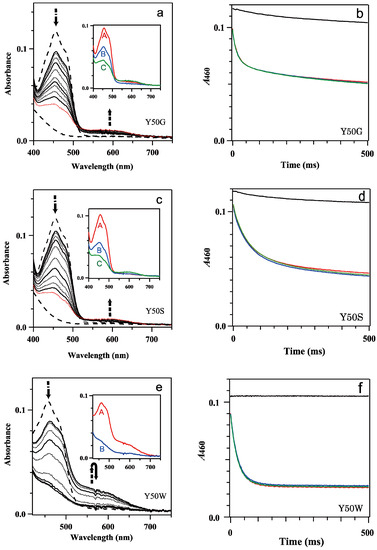 Global analysis of the time-resolved absorption spectra implied that the spectral transition was approximated by a one-step reaction model ([A]→[B]) for Y50W mutant (inset of Figure 2e) and a two-step sequential reaction model ([A]→[B]→[C] (fast/slow)) for Y50G and Y50S mutants (inset of Figure 2a,c). Absorption changes at 460 nm were also approximated with the same kinetic models and similar rate constant values (Table 1, Figure S4). It should be noted that the kII and AII values of Y50G and Y50S mutants (Table 1) contain significant error because the absorbance changes continued beyond the period monitored.