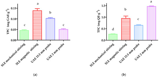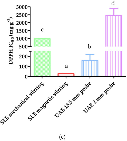 For the TFC, shown in Figure 1b, the SLE assisted by magnetic stirring and heating was significantly lower than the UAE performed with the 2 mm probe (0.9 mg QE·g−1 and 1.46 mg QE·g−1, respectively). The better results of the probe in this respect could be due to the more efficient release of the matrix-bound flavonoids present in the wheat, such as rutin [29], associated with the massive energy released by the ultrasound probe [28]. Furthermore, this compound is not very efficient against DPPH radicals [21], which in turn would account for the higher IC50 value compared with the SLE (Figure 1c).