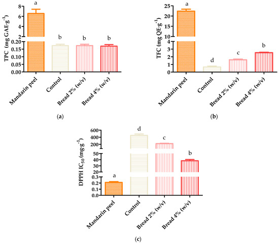 Spectrophotometric determinations of phenolic extracts of mandarin peel, control bread, and enriched bread at 2% (w/v) and 4%(w/v): (a) total phenolic content; (b) total flavonoid content; (c) DPPH antioxidant activity. Data with different letters are significantly different at p−value < 0.05, according to one-way ANOVA and Fisher’s LSD test.