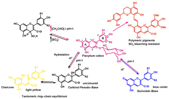 Anthocyanins are flavonoid pigments with variable colors from yellow-orange (490 nm) to red-blue (540 nm), with healthy nutritional properties widely distributed in fruits and flowers and with useful properties as food pigments [1,2,3,4,5]. Anthocyanins can act as antioxidants, phytoalexins, or antimicrobial compounds [6,7]. Anthocyanins behave as weak acids, hard and soft electrophiles, nucleophiles, and metal ion binders [8]. The main degradation effects that can affect anthocyanins are oxidative yield processes, which can be accelerated by temperature [9]. Anthocyanins can also be affected by light (photooxidation) [10] and oxidized by oxygen directly or via enzymes such as polyphenol oxidases and peroxidases [9,10]. Stability and color are also affected by pH, SO2 bleaching, copigmentation, or the formation of polymers with other flavonoids, such as catechins or proanthocyanidins (Figure 1). Non-thermal emerging technologies such as high-pressure processing by High Hydrostatic Pressure (HHP) or Ultra-High Pressure Homogenization (UHPH) can be used to gently extract and preserve juice anthocyanins, increasing extraction rates and stability [11,12].