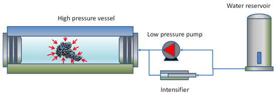 High Hydrostatic Pressure (HHP) is the application of pressure to food by a pressurizing fluid, usually water, inside a highly resistant steel vessel (Figure 2). Initially, the vessel is filled with water using a high-flow, low-pressure pump, and later, the water is pressurized to a typical range of 500–600 MPa using a special pump called a pressure intensifier (Figure 2). Under these pressure conditions, the water and the food inside are compressed by about 4%. The pressurization is produced with some temperature increase due to adiabatic heat compression, which is typically lower than 4 °C/100 MPa (<3.4 °C water, <3.8 °C orange juice, [13]), producing a global heating of up to 24 °C at 600 MPa. The temperature increase also depends on the composition, which is higher for oil components. HHP is a technique that can be considered a non-thermal technology because of this soft heating, without any degradative effect on thermally sensitive molecules such as pigments or aromatic compounds [14,15]. Low adiabatic heating can be additionally controlled by cooling the vessel with heat exchangers.
