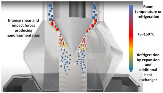 Figure 3. Effect of impact and shear forces on colloid nanofragmentation and temperature in a UHPH valve (adapted from http://www.ypsicon.com/ (accessed on 15 July 2023)).