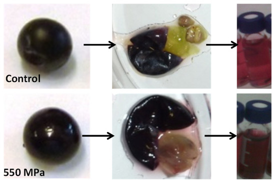 The extraction of anthocyanins by HHP is influenced by the intensity of pressure, temperature, and polarity (ethanol content) [26]. In addition, the substitution pattern in the anthocyanin ring also affects the extraction, depending on the -OCH3 and -OH substituents [26]. We have observed that after HHP treatment of grapes, even if the external appearance remains unaffected, perhaps just a little more brilliant, the surface looks as if it has been pored; the migration of anthocyanins into the pulp can be observed because of the red color (Figure 4) [25]. The permeability of the cells increases, and the diffusion of anthocyanins is improved [37]. The anthocyanins are released from the vacuoles in the skins and later migrate to the pulp, but also to the seeds during the HHP treatment, and the effect is pressure-dependent. The higher the pressure, the more intense the extraction, reaching higher concentrations of anthocyanins in the juice of the grapes processed at 550 MPa/10 min compared to the 200 and 400 MPa treatments [25]. A similar effect was observed in total polyphenols but with a less pressure-dependent behavior when a comparable extraction was observed at pressures in the range of 200–550 MPa. The increase in the extraction of total polyphenols was in the range of 20–25% [25]. The extraction of anthocyanins can range from 20 to 80%, depending on the processing parameters (pressure, time, temperature, and polarity) and the conditions of the grape (ripeness, skin thickness and resistance, and previous processes) or grape by-products [25,26,34].