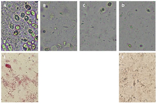Figure 5. Optical microscopy of red juices from two varieties treated with UHPH, Tempranillo (Vitis vinifera L.) (A) Control 0.1 Mpa; (B) UHPH 240 Mpa; (C) UHPH 270 Mpa; (D) UHPH 300 MPa; Cabernet Sauvignon (Vitis vinifera L.); (E) Control 0.1 Mpa; (F) UHPH 300 MPa.