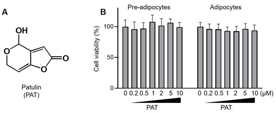 Effects of patulin (PAT) on the viability of 3T3-L1 adipocytes. (A) Chemical structure of PAT. (B) The 3T3-L1 preadipocytes were treated with different concentrations of PAT (0–10 μM, left bar graph). The 3T3-L1 preadipocytes were differentiated in a medium containing MDI in the presence of different concentrations of PAT for 8 days (right bar graph). Cell viability was measured using a WST-1 kit.