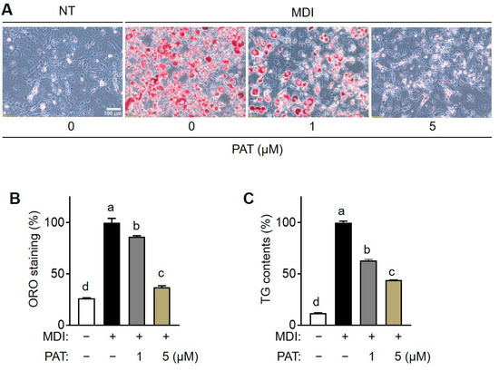 The 3T3-L1 cells were purchased from the American Type Culture Collection (ATCC, Manassas, VA, USA). Cells were cultured in high-glucose Dulbecco’s Modified Eagle’s Medium (DMEM) (Welgene, Gyeongsan, Republic of Korea) containing 10% BCS (Welgene) and 1% penicillin-streptomycin (10,000 U/mL) solution (Gibco, Carlsbad, CA, USA) at 37 °C in a 5% CO2 atmosphere. To induce differentiation, confluent cells were incubated in DMEM containing 10% FBS (Welgene) and MDI (0.5 mM of IBMX, 1 µM of DEX, and 10 µg/mL of insulin) for 2 days. The medium was replaced with DMEM containing 10% FBS and 10 µg/mL of insulin every other day. The cells were treated with or without PAT for 8 days during adipogenesis.