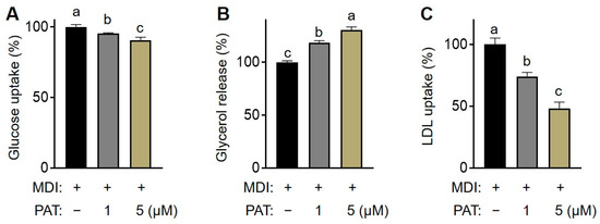 To elucidate the mechanism of PAT in lipid accumulation in mature 3T3-L1 cells, we investigated changes in glucose uptake, glycerol release, and LDL uptake following PAT treatment. Specifically, the levels of glucose and glycerol in the cell culture medium were determined after treatment with PAT (1 or 5 µM). PAT treatment significantly suppressed glucose uptake in a dose-dependent manner, as evidenced by a higher glucose content in the PAT treatment group than in the untreated group (Figure 3A). Additionally, PAT treatment significantly increased glycerol concentration in the culture medium (Figure 3B) and induced a dose-dependent decrease in LDL uptake compared with that in the control group (Figure 3C). Overall, these results indicate that PAT regulates glycolipid metabolism by inhibiting glucose and LDL uptake and promoting the release of glycerol in mature adipocytes.