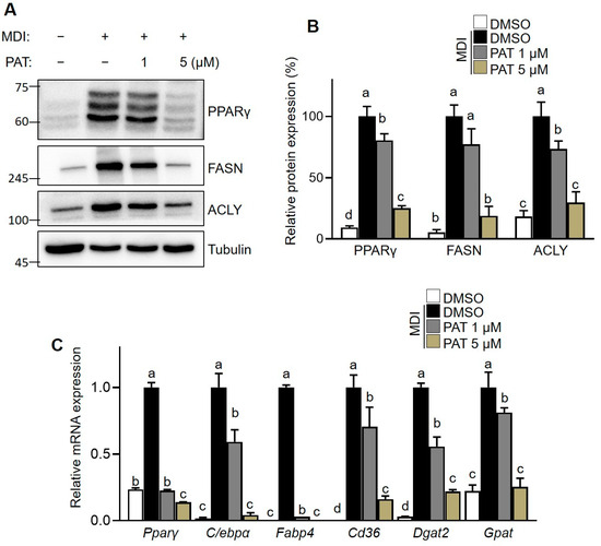 PAT was obtained from MedChem Express (#HY-N6779, Monmouth Junction, NJ, USA). 3-(4,5-Dimethylthiazol-2-yl)-2,5-diphenyltetrazolium bromide (MTT) and other reagents were purchased from Sigma–Aldrich (St. Louis, MO, USA). Antibodies against PPAR gamma (16643-1-AP, Proteintech, Chicago, IL, USA), FASN (#sc-48357, Santa Cruz Biotechnology, Santa Cruz, CA, USA), ACLY (#15421-1-AP, Proteintech), PGC1 alpha (#PA1-31202, Invitrogen, Carlsbad, CA, USA), α/β-tubulin (#2148, Cell Signaling Technology, Danvers, MA, USA), and β-actin (#sc-47778, Santa Cruz Biotechnology, Santa Cruz, CA, USA) were used for Western blotting.