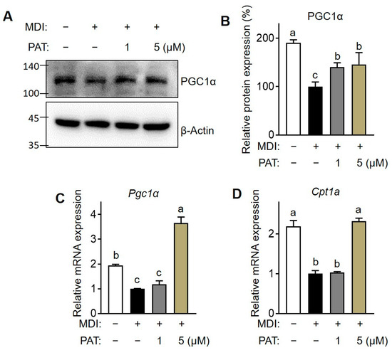 Effects of patulin (PAT) on the expression of fatty acid oxidation-related genes in 3T3-L1 adipocytes. The 3T3-L1 cells were cultured and induced to differentiate in the presence of PAT (1 or 5 µM) for 8 days. (A) Protein expression levels of PGC1α were determined by immunoblotting. (B) The bar graph indicates the relative intensity of PGC1α/ β-Actin bands. mRNA expression levels of (C) Pgc1α and (D) Cpt1a were analyzed using RT-qPCR. Data are expressed as the mean ± standard deviation (SD; n = 3). Different letters indicate significantly different values at p < 0.05, as determined by one-way ANOVA followed by Tukey’s post hoc test.