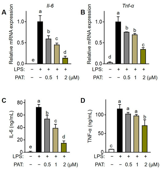 Macrophages are crucial immune cells involved in obesity-associated chronic low-grade inflammation [30]. In addition to its antilipidemic effect in 3T3-L1 adipocytes, we investigated the effect of PAT in inflammatory response in LPS-treated RAW 264.7 macrophages. MTT assay demonstrated that PAT was not cytotoxic to RAW 264.7 cells at concentrations ≤2 µM (Figure S2). Additionally, PAT treatment significantly suppressed LPS-induced transcription of the pro-inflammatory Tnf-α and Il-6 genes in a dose-dependent manner (Figure 7A,B). Moreover, the LPS-induced increase in the secretion of both IL-6 and TNF-α was significantly inhibited by PAT treatment in a dose-dependent manner compared with that in the untreated group (Figure 7C,D). Overall, these results indicate that PAT reduces pro-inflammatory cytokine production in LPS-induced macrophages.