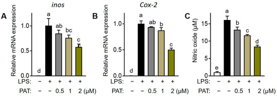 Furthermore, we investigated the effects of PAT on inflammatory mediators, including inducible nitric oxide synthase (iNOS) and cyclooxygenase-2 (COX-2). PAT treatment at concentrations ≥1 µM significantly inhibited LPS-induced upregulation in the mRNA expression of inos and Cox-2 (Figure 8A,B). Moreover, PAT treatment significantly suppressed the LPS-induced increase in the production of nitric oxide (NO), a byproduct of inos, in a dose-dependent manner compared with that in the untreated group (Figure 8C). These findings suggest that PAT may improve inflammatory response by inhibiting the production of pro-inflammatory cytokines and mediators in LPS-stimulated macrophages.