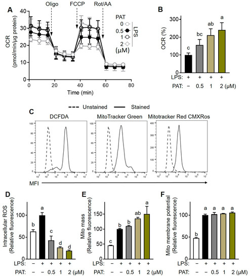 Effects of patulin (PAT) on mitochondrial oxidative function in lipopolysaccharide (LPS)-induced RAW 264.7 macrophages. (A,B) Oxygen consumption rate (OCR) was measured as described in the Materials and Methods section. Representative data from three independent experiments are presented. The indicated values were normalized to the protein content, determined using BCA assay. (C) Flow cytometry was performed to examine macrophages stained with DCFDA, MitoTracker Green, and MitoTracker Red CMXRos. (D) Intracellular ROS levels, (E) mitochondria (Mito) mass, and (F) Mito membrane potential were determined using mean fluorescence intensity (MFI) obtained through flow cytometry, employing specific probes for staining. The data were normalized to the values of LPS-treated control. Different letters indicate significantly different values at p < 0.05, as determined using one-way ANOVA followed by Tukey’s post hoc test.
