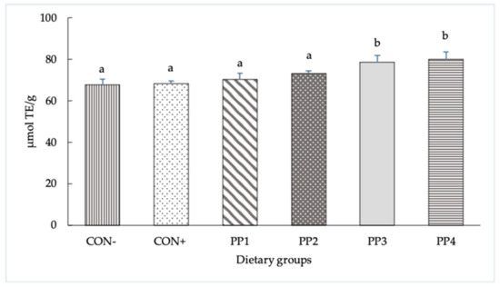 The antioxidant activity levels of the six experimental diets measured using the ORAC assay are reported in Figure 1. The ORAC values of the experimental diets showed a significant difference between groups (p < 0.001), with concentrations equal to 67.8, 68.4, 70.5, 73.3, 78.6 and 80.0 µmol TE/mg in the CON−, CON+, PP1, PP2, PP3 and PP4 groups, respectively, with PP3 and PP4 showing the highest values.