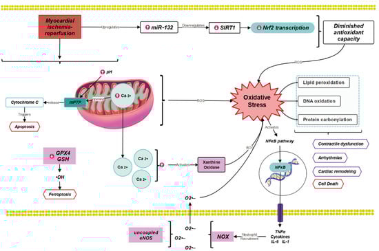 Role of oxidative stress in myocardial damage caused by ischemia followed by reperfusion. The increase in cytosolic calcium is associated with the activation of XO, which is an enzyme with pro-oxidant properties. The increase in calcium inside the mitochondria and the increase in pH during reperfusion lead to the opening of the mPTP, which causes the decrease in the mitochondrial transmembrane potential linked to ROS generation. These reactive oxygen molecules activate the transcription factor NF-κB, promoting inflammation and neutrophil migration to the injured region as well as increasing ROS production by NADPH oxidase. Also, ROS originates from uncoupled eNOS, oxidizing lipids, proteins, and DNA, triggering cell death. In addition, apoptosis is induced by the release of cytochrome c via mPTP, whereas ferroptosis is inducted by reduced GSH and GPX4 activity, leading to the accumulation of lipid peroxidation products. Furthermore, miR-132 directly targets SIRT1 and negatively regulates its expression, leading to a decrease in Nrf2 transcription, which in turn results in diminished antioxidant capacity; Ca2+: calcium; DNA: deoxy-ribonucleic acid; NF-κB: nuclear factor kappa B; eNOS: endothelial nitric oxide synthase; O2•−: superoxide anion; NOX: NADPH oxidases; TNFα: tumor necrosis factor-alpha; IL-6: interleukin 6; IL-1: interleukin 1; miR-132: microRNA-132; SIRT1: sirtuin 1; Nrf2: nuclear factor erythroid 2-related factor 2.