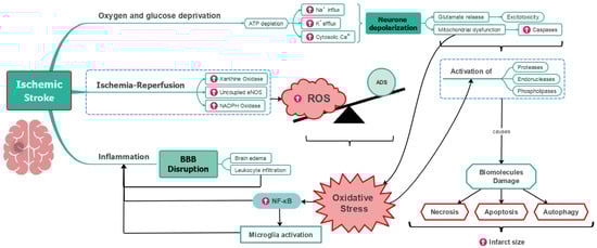 From a clinical perspective, it is crucial to acknowledge that early reperfusion is currently is the sole therapy employed to decrease the infarct size in patients with IS, where a significant proportion of them fail to achieve fully recovery [56]. This may be attributed in part to the lethal injury, caused by reperfusion, to neurons in the penumbra [57]. Thus, the development of new strategies for neuroprotection to improve clinical outcomes appears urgent [56]. Although many antioxidant agents are being investigated to prevent cerebral IRI, they are yet not commonly utilized in healthcare services, as their mechanisms of action and potential clinical consequences have not been precisely clarified [58]. The role of OS in stroke pathophysiology is summarized in Figure 2.
