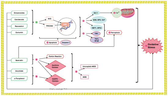 Quercetin has been extensively investigated for its effect on ameliorating OS. This compound has been found to have the ability to scavenge free radicals [117] and to induce the expression of the antioxidant enzyme HO-1, which in turn helps to reduce OS caused by the enzyme NOX [118]. In addition, it has been observed that quercetin can suppress the expression of NOX2, which is an isoform of the NOX system that plays an important role in the production of ROS, such as H2O2 [119]. The overproduction of NOX has been shown to contribute to neurotoxicity and cerebrovascular disease, and it has been implicated as a major source of ROS in the brain [120]. Another promising effect of quercetin is its ability to attenuate the expression and activity of XO, which is another relevant enzyme in ROS production [121]. In addition to its antioxidant effects, quercetin protects against apoptosis and ROS generation by preserving mitochondrial function and preventing the release of cytochrome c [122]. It has also been shown to inhibit the function of myeloperoxidase, which contributes to atherosclerosis by generating hypochlorous acid from H2O2 [123].