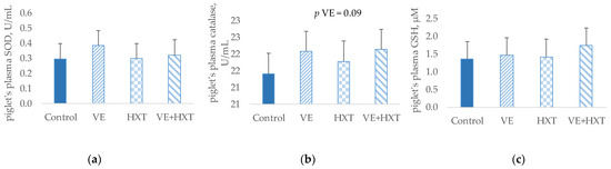 Antioxidant enzymes concentrations (a) superoxide dismutase (SOD); (b) catalase; and (c) total glutathione (GSH) in piglet’s plasma (post-weaning) from sows given α-tocopheryl acetate (VE: 30 vs. 100 mg/kg) or hydroxytyrosol (HXT: 0 vs. 1.5 mg/kg) during gestation and lactation. Control = 30 mg of α-tocopheryl acetate/kg feed + 0 mg/kg hydroxytyrosol; VE = 100 mg of α-tocopheryl acetate/kg feed + 0 mg/kg hydroxytyrosol; HXT = 30 mg of α-tocopheryl acetate/kg feed + 1.5 mg/kg hydroxytyrosol; VE + HXT = 100 mg of α-tocopheryl acetate/kg feed + 1.5 mg/kg hydroxytyrosol.