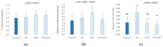Fatty acid proportion of (a) C22:6 n-3; (b) ratio C20:4 n-6/C20:2; and (c) elongase C14 to C16 in piglet’s faeces from sows given α-tocopheryl acetate (VE: 30 vs. 100 mg/kg) or hydroxytyrosol (HXT: 0 vs. 1.5 mg/kg) during gestation and lactation. Control = 30 mg of α-tocopheryl acetate/kg feed + 0 mg/kg hydroxytyrosol; VE = 100 mg of α-tocopheryl acetate/kg feed + 0 mg/kg hydroxytyrosol; HXT = 30 mg of α-tocopheryl acetate/kg feed + 1.5 mg/kg hydroxytyrosol; VE + HXT = 100 mg of α-tocopheryl acetate/kg feed + 1.5 mg/kg hydroxytyrosol. Letter with different superscript were statistically significant.