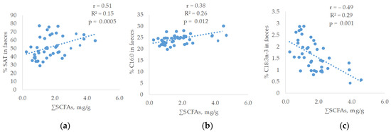 Concerning the relationship between the faecal fatty acid proportions and the SCFAs of faeces, linear and significant relationships were observed (Figure 3).