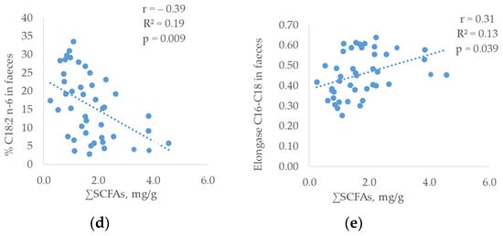 Thus, a linear and positive correlation was found between saturated fatty acids (SAT) (r = 0.51; R2 = 0.15; p = 0.0005) and SCFAs. The SAT fatty acid that showed the highest relationship was C16:0 (r = 0.38; R2 = 0.25; p = 0.012). On the contrary, the faecal proportion of polyunsaturated fatty acids was inversely related to SCFAs content of faeces being C18:3 n-3, the fatty acid that reached the highest correlation (r = −0.49; R2 = 0.29; p = 0.001) followed by C18:2 n-6 (r = −0.39; R2 = 0.19; p = 0.009). In addition, a linear positive relationship was observed between the total SCFAs and the elongase C16 to C18 (r = 0.31; R2 = 0.13; p = 0.039).