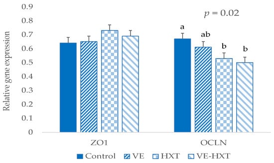Relative expression of OCLN and ZO1 of weaned piglets from sows given α-tocopheryl acetate (VE: 30 vs. 100 mg/kg) or hydroxytyrosol (HXT: 0 vs. 1.5 mg/kg) during gestation and lactation. Control = 30 mg of α-tocopheryl acetate/kg feed + 0 mg/kg hydroxytyrosol; VE = 100 mg of α-tocopheryl acetate/kg feed + 0 mg/kg hydroxytyrosol; HXT = 30 mg of α-tocopheryl acetate/kg feed + 1.5 mg/kg hydroxytyrosol; VE+HXT = 100 mg of α-tocopheryl acetate/kg feed + 1.5 mg/kg hydroxytyrosol. Letter with different superscript were statistically significant.
