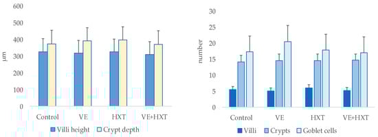 The morphology of the piglet’s duodenum (villi height, crypts depth, number of villi, number of crypts, and goblet cells) was not statistically modified by the antioxidant supplementation of their mothers (Figure 5).