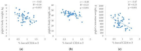 In addition, the relationship between the faecal composition and the growth pattern of the piglets (measured and published by Gómez et al. [31]) was evaluated (Figure 6). No significant relationships were observed between the SCFAs and the piglet’s growth. However, the piglet’s size was related to the abundance of specific fatty acids in faeces. Thus, faecal C22:6 n-3 was inversely related to body weight (r = −0.42, R2 = 0.18, p = 0.003), body length (r = −0.48, R2 = 0.23, p = 0.001) and intestine weight (r = −0.47, R2 = 0.23, p = 0.001).