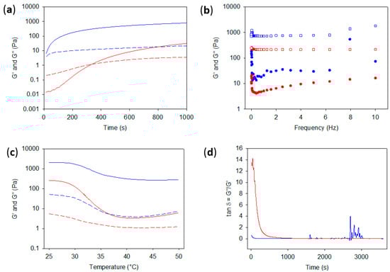 Comparison between porcine (in blue) and bovine (in red) gelatin in PDA–gelatin gels through rheology: (a) gelation kinetics; (b) frequency sweep experiments; (c) temperature ramp experiments; (d) and tan δ = G″/G′ depending on the time for gelation. In panels (a,c), the solid curves and the dashed lines represent G′ and G″, respectively. In panel (b), the open squares and filled disks represent the G′ and G″ values, respectively. Data were taken from three unrelated experiments each.