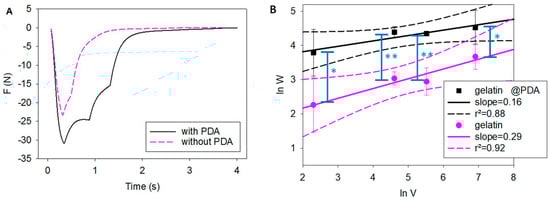 For purely elastic materials, W does not depend either on the contact time between two materials or on the peeling rate, at least in a very broad range of values. Such peeling rate dependencies are characteristic, among other mechanical properties, of viscoelastic materials; the tensile work per unit area between two cetyltrimethylamonium bromide coated monolayers on mica displays a 0.5 power law when lnW is plotted against lnV [23]. The same power law dependency has been found for polyhydroxyethylmethacrylate hydrogels modified with dopamine in the side chain at up to 10.7% (mol/mol) [22]. In the present investigation, the power law dependency is much less pronounced, being equal to 0.29 ± 0.03 and 0.16 ± 0.04 for pristine gelatin gels and for PDA–gelatin hydrogels, respectively. Those slopes are statistically different (p < 0.05) based on Student’s t-test. Interestingly, the peeling rate dependency is stronger for the unmodified gel, which may be explained by its higher G” value relative to the G’ value (quantified by the loss tangent value, Figure 1d) when compared to those of the PDA–gelatin gel. Both kinds of gels, even if they display a marked power law dependency of lnW versus lnV, nevertheless deviate significantly from the 0.5 power law dependency found by others [22,23]. We assume that this phenomenon originates from an elastic behavior that is predominant with respect to the viscous behavior responsible for energy dissipation in both gels, being more so when PDA is present as a “crosslinker” in the gel (Figure 1a,d).