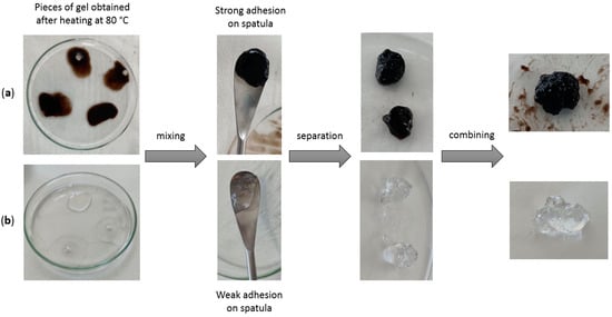Process showing gelatin gel’s self-healing properties after 80 °C thermal treatment and mixing at room temperature (a) with PDA; (b) without PDA.