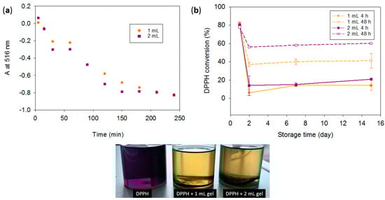 Antioxidant properties of PDA–gelatin gels tested with DPPH: (a) DPPH scavenging kinetics for 1 mL (●) and 2 mL (■) of PDA–gelatin gel followed by UV-vis spectroscopy at 516 nm, and a picture of DPPH in contact with gels after 4 h; (b) percentage of DPPH conversion depending on the storage time of the gel for an amount of 1 mL after 4 h (▬●▬) and 48 h (- -◯- -), and 2 mL after 4 h (▬■▬) and 48 h (- -☐- -) of measurement. In panel b, lines were added for the purpose of clarity. Data and standard deviations come from three unrelated experiments each.