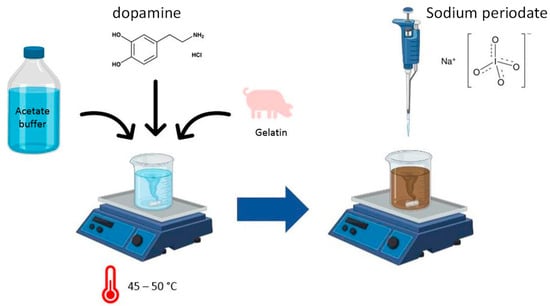 Dopamine hydrochloride (DA) (prepared to reach a final concentration of 1.5 mg/mL) (Sigma Aldrich, ref: H8502), and bovine or porcine gelatin (to reach 10% w/w) were dissolved in sodium acetate buffer (Merck, Darmstadt, Germany, ref: 1.06268, 50 mM, adjusted to pH = 5). This pH value was chosen because the autoxidation of dopamine (due to dissolved O2) is extremely slow under these conditions, and hence an external oxidant has to be added to trigger the oxidation of dopamine into PDA [30]. The suspension was magnetically stirred and heated until the temperature reached 45–50 °C and the gelatin was completely dissolved. This mixture was then titrated with a concentrated solution of NaIO4 (Sigma Aldrich, ref: 311448) under strong stirring to reach a final NaIO4/DA ratio of 2. The whole experimental procedure is shown in Scheme 1.