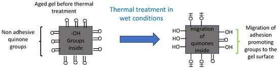 The self-healing behavior of thermally treated PDA–gelatin gels but not of the unheated PDA–gelatin gels is of course only qualitative information but it suggests that the as-prepared gels can be stored and can recover a part of their adhesive properties by simply inducing some mobility (here emphasized by a decrease in G” upon heating, Figure 1d). We make the assumption that the thermal treatment of the PDA–gelatin gels allows a migration of part of the non-oxidized catechol groups present in the gel structure on their surface (Scheme 2), allowing for the regeneration of adhesive properties. Such groups are present in the gel structure and contribute to its cohesion; indeed, during the peeling tests, the gels’ rupture was found to be cohesive. The validity of such an assumption will be tested in future investigations.