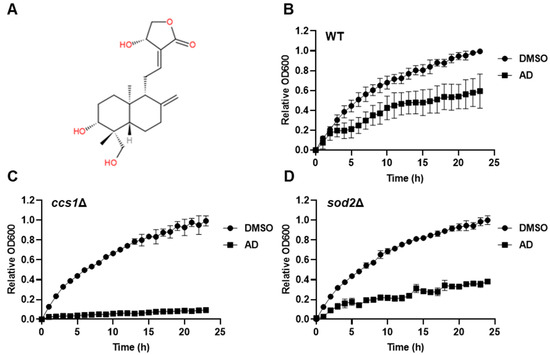Andrographolide exhibits cytotoxicity in S. cerevisiae with ROS synergy. (A) Chemical structure of andrographolide. (B) Growth curves of wild-type (WT) yeast cells in synthetic minimal media supplemented with 2% glycerol in the presence or absence of andrographolide (AD). DMSO serves as control. Means ± SD (error bars) are shown (n = 3). (C,D) Similar to (B), but ccs1Δ and sod2Δ yeast mutant cells were used, respectively.