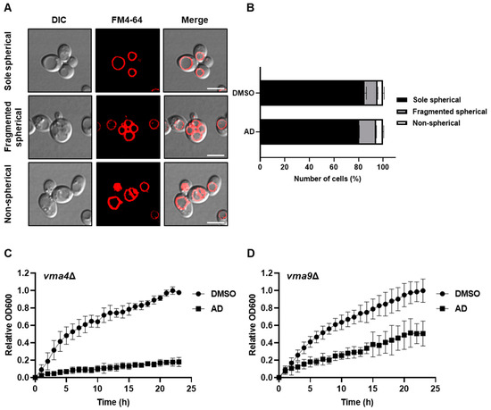 Andrographolide induces vacuole fragmentation. (A) Representatives of three vacuole morphologies observed in FM4-64 staining. Scale bar, 5 µm. (B) Quantification of different vacuole morphologies in the presence or absence of andrographolide (AD). DMSO serves as control. Means ± SD (error bars) from two replicates with more than 2000 cells per replicate are shown. Statistical analysis was carried out using a two-way ANOVA with Sidak’s comparison between AD and DMSO serving as control conditions (p = 0.0009 for sole spherical, p = 0.003 for fragmented spherical). (C,D) Similar to (B), but vma4Δ and vma9Δ yeast mutant cells were used, respectively.