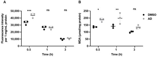 Andrographolide induces lipid peroxidation and ROS elevation. (A) Reactive oxidative species (ROS) in cells exposed to andrographolide for the indicated time period were assessed by 2′,7′-dichlorofluorescin diacetate (DCFDA) staining. Each dot represents the fluorescence intensity per 1 mg/mL protein. Error bars indicate the SD of three independent biological replicates. Statistical significance was calculated using a two-way ANOVA with Sidak’s multiple comparisons (***, p < 0.001; ns, not significant). (B) Similar to (A), but ROS-mediated lipid oxidation was assessed by TBARS assay via spectrophotometric detection of its end product malondialdehyde at 535 nm. Each dot represents the amount of calculated MDA in µmol/mg protein unit. Error bars indicate the SD of three independent biological replicates. Statistical significance was calculated using a two-way ANOVA with Sidak’s multiple comparisons (*, p < 0.05; **, p < 0.01; ns, not significant).