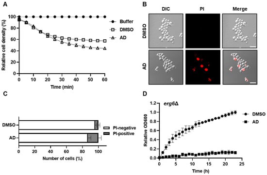 Andrographolide compromises cell integrity and affects ergosterol-dependent membrane stability. (A) Zymolyase sensitivity of yeast cells treated with andrographolide. Cells were treated with 0.4 U of Zymolyase and OD600 was observed at the indicated time point. DMSO serves as control. (B) Propidium iodide staining of yeast cells treated with andrographolide. DMSO serves as control. Scale bar, 10 µm. (C) Quantification of (B). Means ± SD (error bars) from three replicates (n > 100 per replicate) are shown. Statistical analysis was carried out using a two-way ANOVA with Sidak’s comparison between AD and DMSO serving as control conditions (p = 0.017 for PI positive). (D) Similar to Figure 1B, but erg6Δ mutant cells were used.
