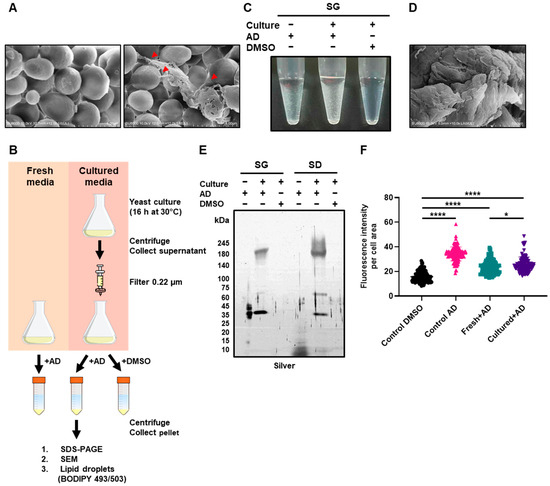 Andrographolide induces sheet-like structures, impacting yeast cells. (A) Scanning electron micrographs of yeast cells treated with or without andrographolide. Two representative micrographs are shown. The red arrows indicate sheet-like structures that cover yeast cells. (B) A diagram depicting an andrographolide-induced precipitation assay. Either fresh or cultured media were mixed with andrographolide to the final concentration of 1 mg/mL, centrifuged, and washed with sterile distilled water. (C) The precipitation in SG media from the experiment represented in (B). (D) Similar to (A), but the pellets formed after mixing andrographolide with cultured media were analyzed. (E) The pellets were resuspended in 2× SDS-PAGE loading buffer and subjected to SDS gel electrophoresis followed by silver staining. (F) Quantification of fluorescent intensity from BODIPY 493/503 staining. Each dot represents fluorescence intensity per cell area measured by ImageJ (version 1.53t). Statistical analysis was carried out via a two-tailed unpaired t-test with a Mann–Whitney test (*, p < 0.05; ****, p < 0.0001).