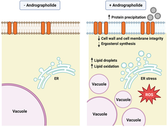 Here, we observed that andrographolide exhibited cytotoxic effects in yeast, particularly when aerobic respiration and oxidative phosphorylation were active. While most organelles appeared normal, vacuoles showed increased fragmentation under andrographolide-induced stress. Furthermore, andrographolide triggered the activation of the ER stress response pathway, an accumulation of lipid droplets, elevated levels of ROS, and increased lipid peroxidation. As a result, cell integrity was likely compromised under andrographolide treatment. Remarkably, we also discovered that andrographolide induced the precipitation of proteins secreted by yeast cells, adding an additional source of extracellular stress. This observation highlights the potential contribution of extracellular factors to the overall effects of andrographolide (Figure 7).