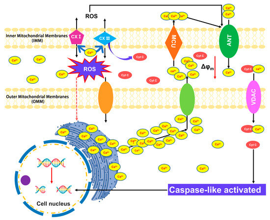 Schematic representation of ROS-dependent signaling involved in programmed cell death (PCD). Increased reactive oxygen species (ROS) production from mitochondria may trigger Ca2+ influx from the endoplasmic reticulum (ER), and cytoplasm enters the mitochondrial matrix through voltage-dependent anion channels (VDACs) or calcium uniporter (MCU). High levels of Ca2+ in the mitochondrial stimulate respiratory chain (CXI and CXIII) activity, which leads to higher amounts of ROS, which can further lead to the increased release of Ca2+. Further, the increased ROS and Ca2+ load in mitochondria will promote the opening of mitochondrial permeability transition pores (MPTPs), which span the inner (IMM) and outer mitochondrial membranes (OMM) and are mainly composed of cyclophilin D (D), adenine nucleotide translocator (ANT), and VDAC. The prolonged opening of MPTP leads to a significant increase in the permeability of the IMM to solutes with molecular masses < 1500 Da as a consequence of the charge difference between the mitochondrial matrix and the cytosol (mitochondrial membrane potential, Δφm). Subsequently, mitochondria swell irreversibly, causing the OMM to rupture while releasing cytochrome C (Cyt C) from inter-membrane space to the cytoplasm. High Cyt C levels will initiate the activity of caspase-like enzymes, which will enter the nucleus, resulting in typical PCD changes such as DNA fragmentation and disruption of the nucleus.