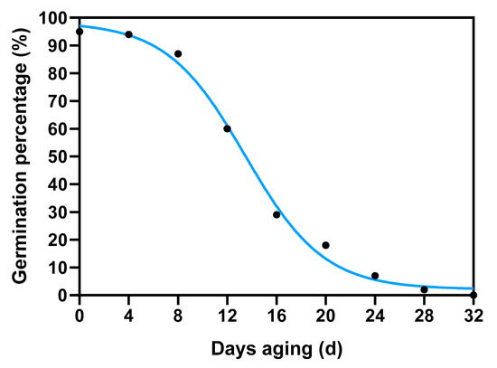 Alfalfa (cv Zhongmu No. 1) seeds were harvested in 2019 at the Forage Seed Propagation Station of China Agricultural University, situated at coordinates 37 N, 98.30 E, and an elevation of 1480 m, in Jiuquan City, Gansu province, China. Seed aging treatment was carried out following the established methodology outlined in the study by Xia et al. [24]. Briefly, seeds pre-adjusted to 10% moisture content on a fresh-weight basis were immediately sealed in an aluminum foil bag (0.12 × 0.17 m2, approx. 40 g in each bag) at 45 °C in a water bath. After 0 d of treatment, samples began to be taken out every four days. The germination percentage declined to 70% on the 10th day and decreased to 0% on the 32nd day (Figure 2). Seeds treated from the 0th day to the 32nd day with a range of germination percentages were obtained for subsequent tests; they were marked as D0, D4, D8, D12, D16, D20, D24, D28, and D32, respectively. The control seeds were marked as D0. Both control (CK) and aged seed samples were collected at specific time points after imbibition, specifically at 6, 12, 24, and 36 h. Each sample comprised three biological replicates, and each replicate consisted of seeds collected from at least ten individual seeds. Following the collection, the samples were rapidly frozen and ground to a fine powder using liquid nitrogen to preserve their molecular integrity.
