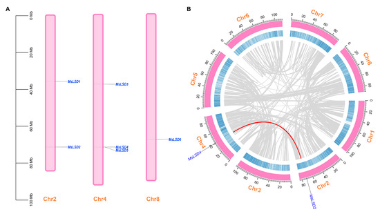Chromosomal distribution of MsLSD genes (A), and segmentally duplication events of MsLSD genes (B). The segmentally duplicated genes are connected by red lines, referring to the 2 genes highlighted in blue.