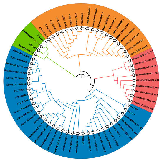 To explore the evolutionary relationships of MsLSD genes in alfalfa, a multiple sequence alignment was performed using Clustal W (http://www.clustal.org/clustal2/ accessed on 11 February 2023). An unrooted phylogenetic tree was then constructed. This was achieved using the online tool Interactive Tree Of Life (iTOL) v5 [18] and the neighbor-joining (NJ) method with 1000 bootstrap replicates. In addition to the NJ method, other phylogenetic tree construction methods were employed to ensure robustness and reliability in the tree topology [19]. To classify the MsLSD genes based on their evolutionary relationships with Arabidopsis LSD genes, a thorough analysis of the phylogenetic tree was carried out. Furthermore, conserved motifs in the MsLSD proteins were identified using the MEME tool (http://meme-suite.org/tools/meme/ accessed on 11 February 2023) [20].