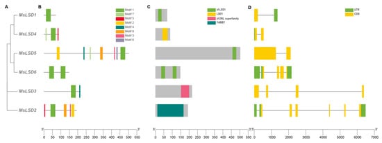 2.2. Phylogenetic, Gene Structure, and Conserved Motif Analyses of the MsLSD Members