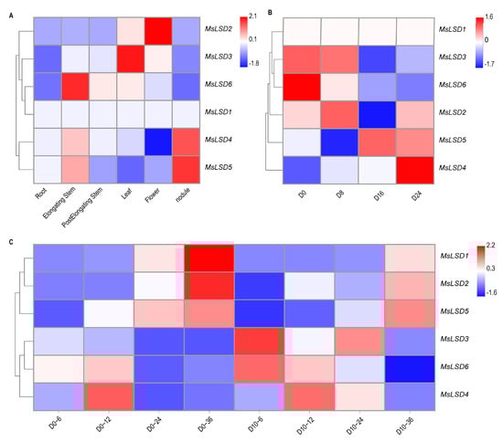 Expression pattern of 6 MsLSD genes in different tissues and seeds of different vigor levels based on RNA-seq data. (A) Expression profile of 6 MsLSD genes in different tissues (leaves, flowers, pre-elongated stems, elongated stems, roots, nodules, and seed) of alfalfa. (B) Expression patterns of the MsLSD gene in seeds aged 0 days (D0), 8 days (D8), 16 days (D16), and 24 days (D24) with different vigor levels. (C) Expression profile of 6 LSD genes in alfalfa seed imbibed for 6, 12, 24, and 36 h under aging treatment. The color scale represents log10 expression values. Red represents up-regulated expression, and blue represents down-regulated expression.