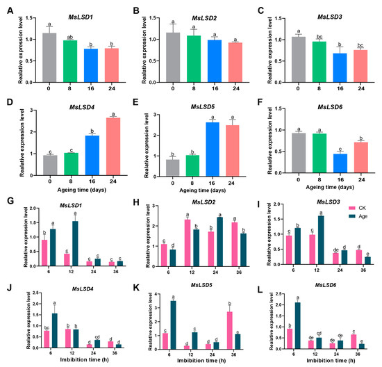 Expression profile of MsLSD genes via RT-qPCR assay. (A–F) Expression level of six MsLSD genes in different vigor alfalfa seeds; (G–L) expression level of six MsLSD genes under seed imbibed for 6, 12, 24, and 36 h after aging treatment using RT-qPCR assay. The data are the means of three biological replicates ± SEM. Different lowercase letters represent significant differences, and p < 0.05 was considered highly significant.
