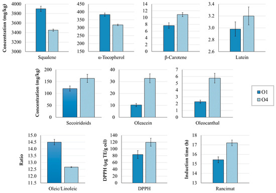 Concentration (mg/kg oil) of squalene, α-tocopherol, β-carotene, lutein, secoiridoids, oleacein, and oleocanthal in the EVOO samples O1 and O4, as well as the oleic/linoleic ratio, antioxidant capacity by DPPH (µg TE/g oil), and oxidative stability by Rancimat (induction time (h)). O1 was produced on the day the olives were harvested, and O4 on the day after harvesting with stored olives. Both EVOOs were malaxed at 18 °C for 30 min. Results are expressed as mean ± standard deviation, n = 9. All variables differed significantly (p < 0.05) between samples.