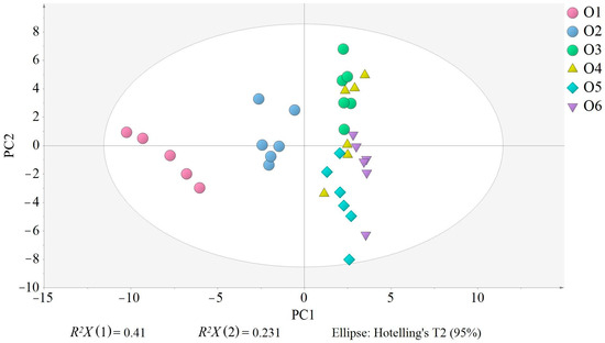 Score scatter plot of the principal component analysis (PCA). EVOO samples are colored and shaped according to their production conditions: O1 (no storage, 18 °C/30 min), O2 (no storage, 18 °C/40 min), O3 (no storage, 18 °C/50 min), O4 (17 h storage, 18 °C/30 min), O5 (17 h storage, 23 °C/30 min), and O6 (17 h storage, 23 °C/40 min). R2X (1) and R2X (2) in the PCA are the variations explained by the first PC and the second PC, respectively, together explaining 66.3% of the variation. All samples were inside the Ellipse Hotelling’s T2, indicating there were no strong outliers.