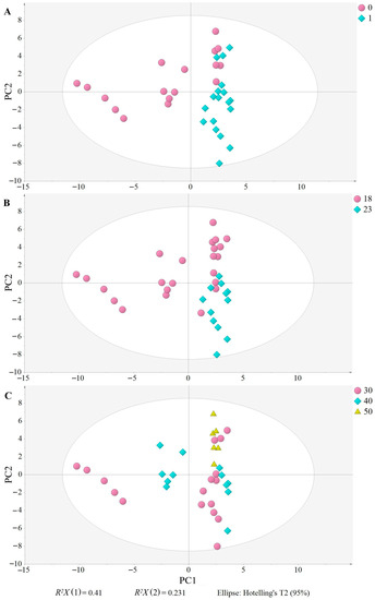 Score scatter plot of the principal component analysis (PCA). EVOO samples are colored and shaped according to the olive storage (A) (0: no storage, 1: 17 h of storage), (B) malaxation temperature (18 °C, 23 °C), and malaxation time (C) (30 min, 40 min, 50 min). R2X (1) and R2X (2) in the PCA are the variations explained by the first PC and the second PC, respectively, together explaining 66.3% of the variation. All samples were inside the Ellipse Hotelling’s T2, indicating there were no strong outliers.